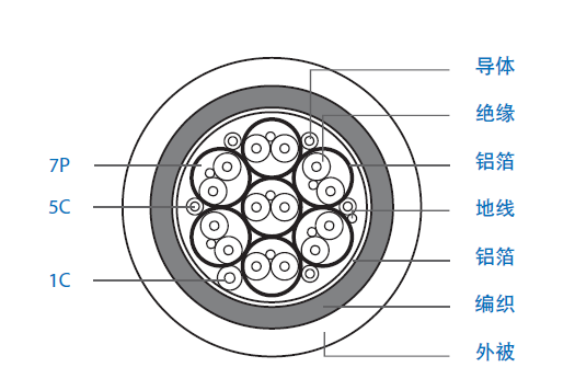 | 導體:28 AWG 鍍錫銅線0.38 | 半成品:7P+6C+地線, 一起成纜 |