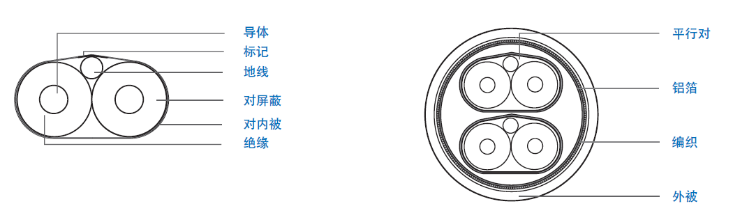| 導(dǎo)體:28 AWG 單根鍍銀銅線, 外徑0.35 mm | 半成品:2 對(duì) (#1-2) 一起成纜 |